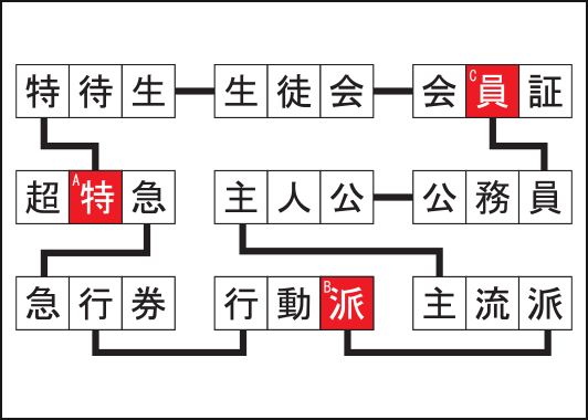 下のリストの漢字をすべてマスに入れ、三字熟語9個を作ります。この時、線でつながれたマスには同じ漢字を入れてください。A~Cでできる三字熟語は何でしょう?