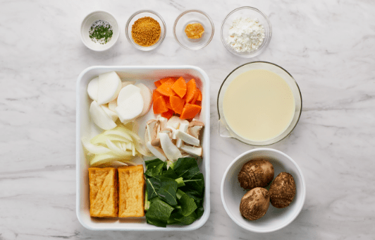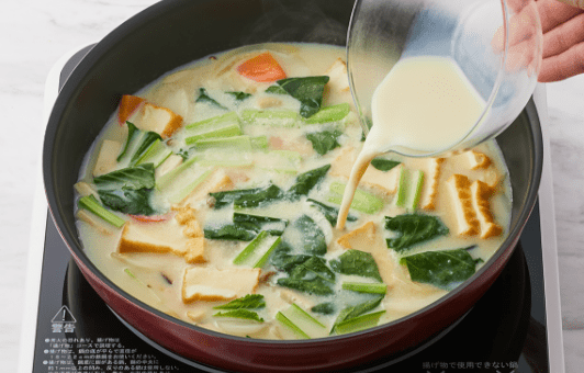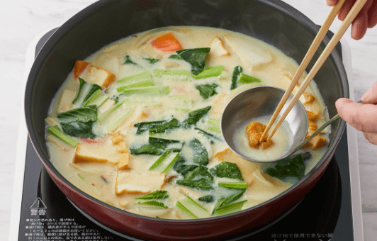 ②に豆乳、みそを溶かし入れ、沸騰しない程度に1分くらい煮る。器に盛り、粉パセリをちらす。