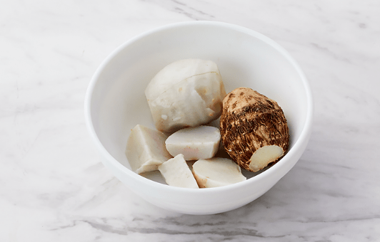 洗った里芋は両端を包丁で少し切り、包丁で縦に切り込みを入れる。耐熱皿に並べ、水を大さじ1杯回しかけ、ふんわりラップをして600W3~4分レンジ加熱する。完全に冷めないうちに皮をむき食べやすい大きさに切る。
