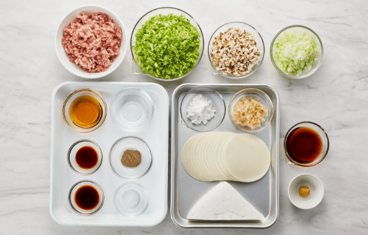 ①を適量のせ、餃子の皮で包む。(餃子の皮の真ん中に①を適量のせ、端に水(分量外)を塗る。半分に折りたたみ閉じる。片方に水をつけ、両端を引き寄せ、しっかり指で押さえて止める。)