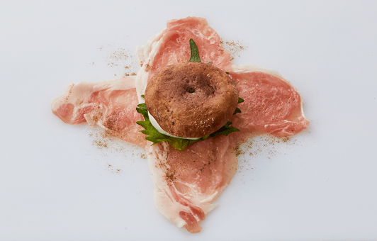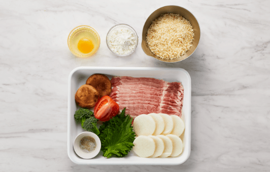 豚肉一枚を広げてクロスに置き、塩こしょうをする。重なった部分に大葉をしき、長芋を置き、野菜(トマト/ブロッコリー/しいたけ)のいずれかを一つ置く。