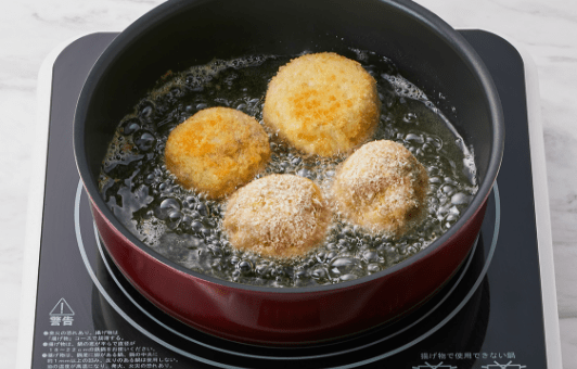 フライパンに2㎝くらいの油(③の厚みの半分くらい浸かる量)を入れ、170度くらいに温め、③の半量入れる。揚げ色がついたら裏返し、両面同じ色になるまで揚げる。残りも同様に揚げ焼きにする。