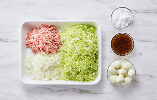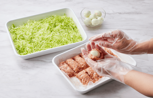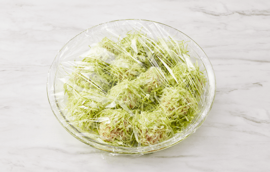 うずら卵を一つずつ中心に入れて丸め、千切りキャベツをまぶしつける。
