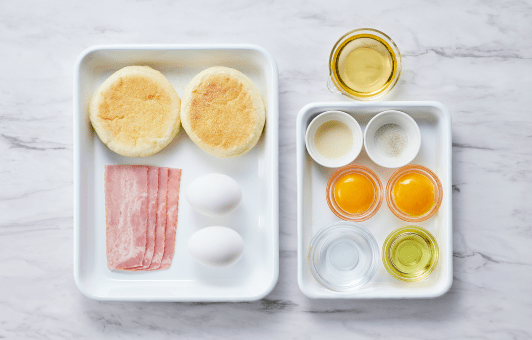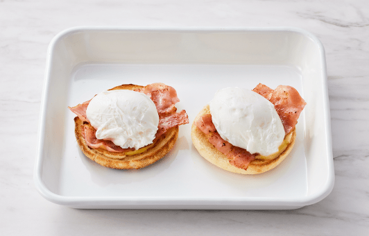 イングリッシュマフィンの断面を上にして置き、ソースを少し塗り、ベーコン、水気を拭いたポーチドエッグを1個のせる。同じものを1セット作り、それぞれお皿に盛り付け、ソースをかける。