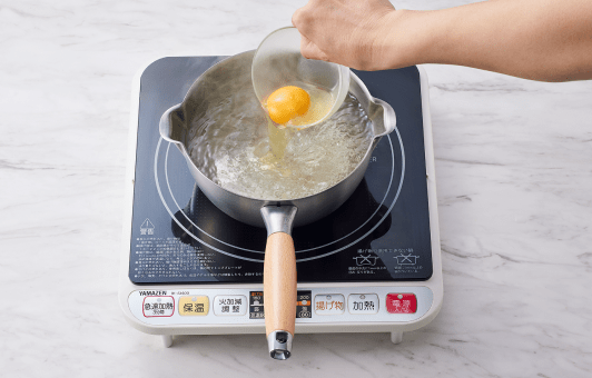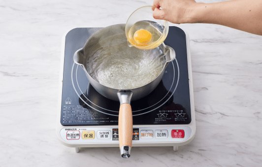 ポーチドエッグを作る。①鍋に水を1ℓ沸騰させ、酢を加える。再度沸騰したらお箸でお湯をぐるぐる回して渦を作る。②中心に卵を静かに入れ、弱火で2分半ゆで、冷水にとる。同様にもう1個作る。