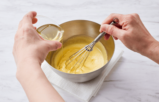 ソースを作る。①ボウルに〈A〉の卵黄と水を入れ、混ぜ合わせる。②ボウルより一回り大きい鍋に底から3cm程度の水を沸騰直前まで沸かし①を置く。③弱火にして泡だて器でよく混ぜ、トロッとしてきたらお湯から外す。④オリーブオイルを少しずつ加えて乳化させ、レモン汁と塩、こしょうで味をととのえる。